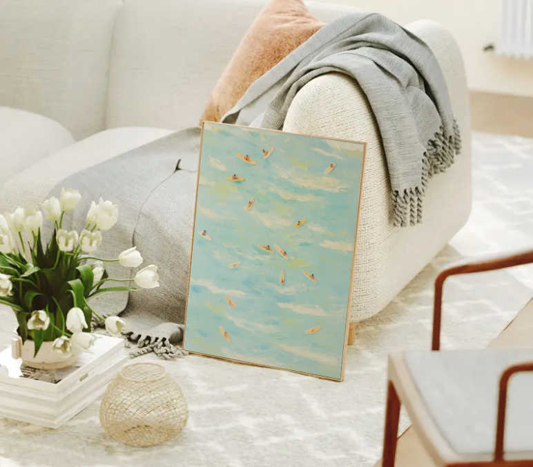 Beach Surf Painting - Bring the calm, refreshing feeling of the coast into your home with this stunning Aerial Surfer Ocean Art Print. The soft blue water, gentle waves, and tiny surfers create a dreamy and relaxing coastal vibe that instantly brightens any room. Painted in a light, airy palette, this artwork captures the beauty of ocean life from a unique top-down perspective. Perfect for beach lovers, surfers, coastal décor fans, and anyone wanting a peaceful, ocean-inspired aesthetic. It pairs beautifully with modern coastal, Hamptons, minimalist, and beach-house interiors.