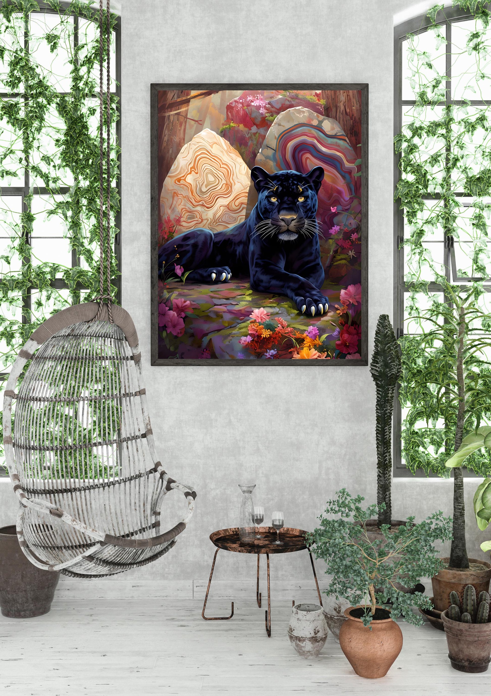 Black Panther wall art - Looking to transform your space with bold, mystical energy? This captivating Black Panther wall art features a majestic jungle cat resting among vibrant geode crystals, blooming florals, and enchanted forest light—creating a magical scene full of power and grace. Perfectly blending boho jungle décor, spiritual animal symbolism, and nature-inspired beauty, this piece is ideal for living rooms, bedrooms, meditation corners, or creative studios. The vivid colors and soft light give it a calming yet powerful presence, while the panther’s gaze adds a touch of mystery and depth.