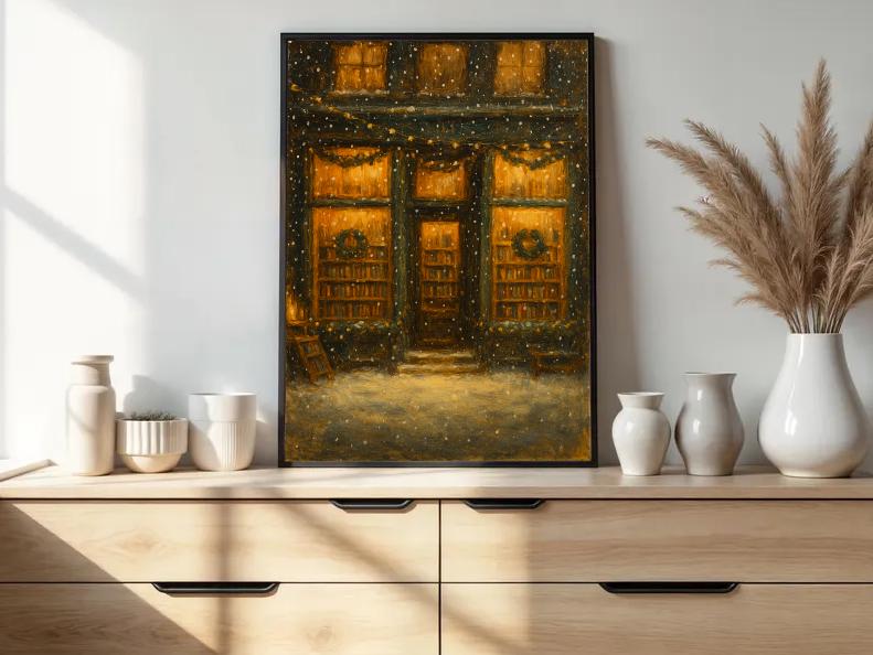 Featuring a softly glowing bookshop window dusted with snow, this painting captures the quiet beauty of winter nights and the comforting charm of a holiday-lit bookstore. Rendered in rich, vintage tones, this artwork evokes the feeling of stepping back in time — the golden glow from the windows, wreaths on the glass, and snow gently falling outside.