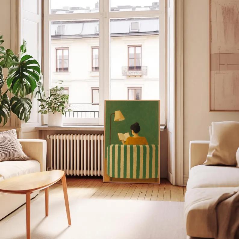 Cozy Reading Woman Art Print: Minimalist Green Home Decor (Digital Download)
