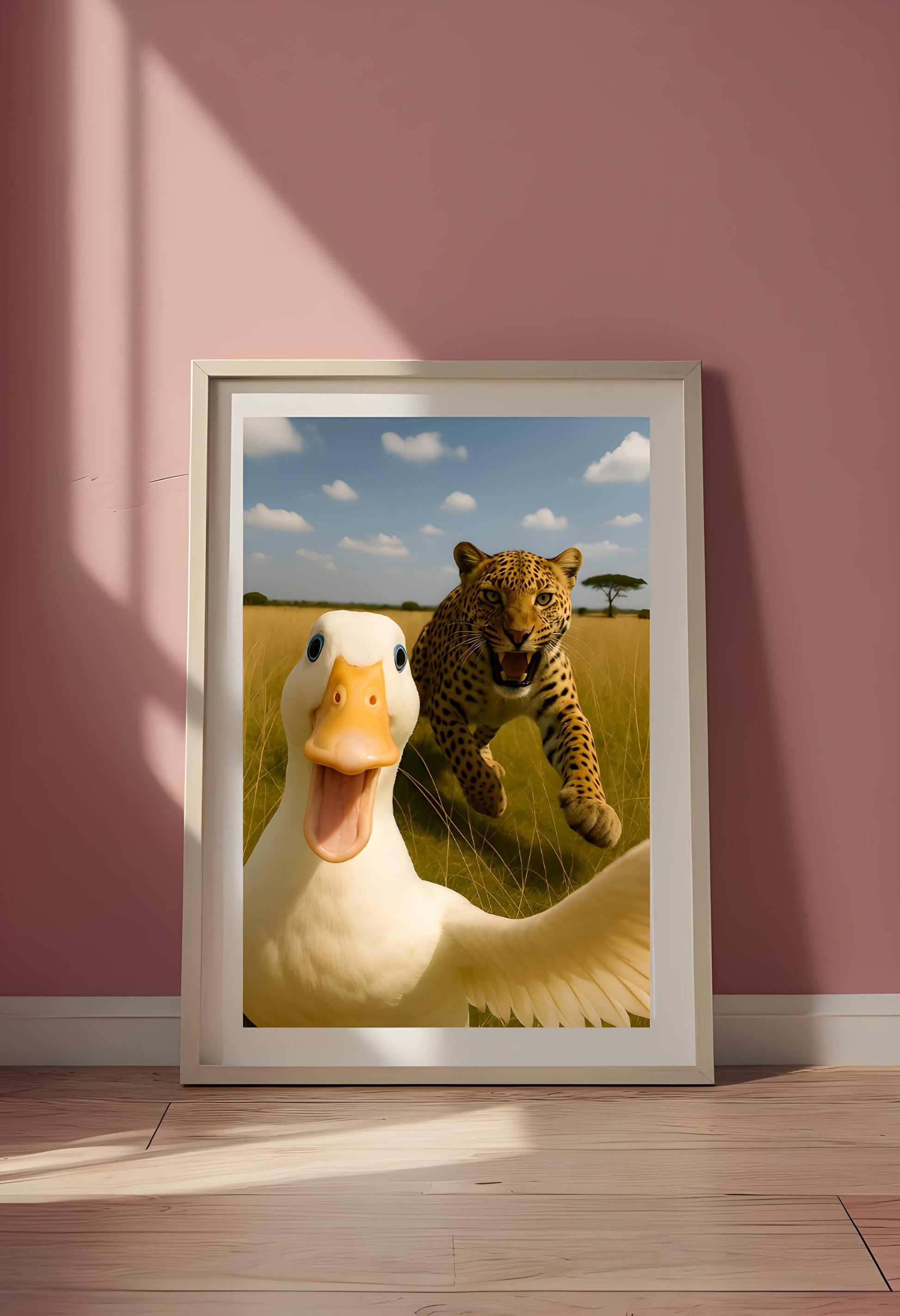 Funny Duck Selfie Wall Art - Need a laugh-out-loud centerpiece for your home or office? This funny duck selfie wall art captures a perfectly timed moment—an enthusiastic duck snapping a selfie while a furious leopard charges in the background! It’s bold, bizarre, and absolutely unforgettable. Whether you're into quirky wildlife photography, meme-style prints, or just love animal humor décor, this high-resolution artwork is guaranteed to be a conversation starter. The blend of absurdity and cuteness makes it ideal for light-hearted spaces like your hallway, bathroom, living room, or office.