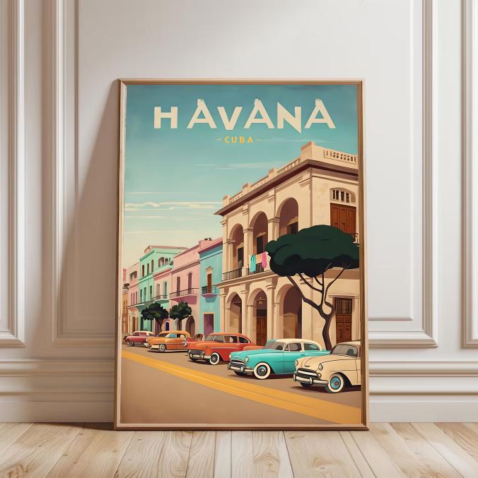Havana Cuba Wall Art - Transform your space with this vibrant Havana Cuba wall art print, featuring classic vintage cars parked along colorful colonial streets. This artwork captures the essence of Havana’s charm and retro flair in a timeless travel poster style. Ideal for world travelers, culture lovers, and retro art enthusiasts, this print brings the warmth and vibrancy of Cuba into your home. With its bold pastel buildings, iconic 1950s cars, and nostalgic aesthetic, it’s a piece of wall décor that instantly sparks conversation.