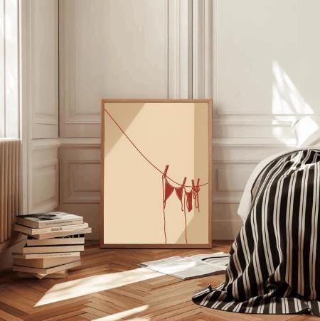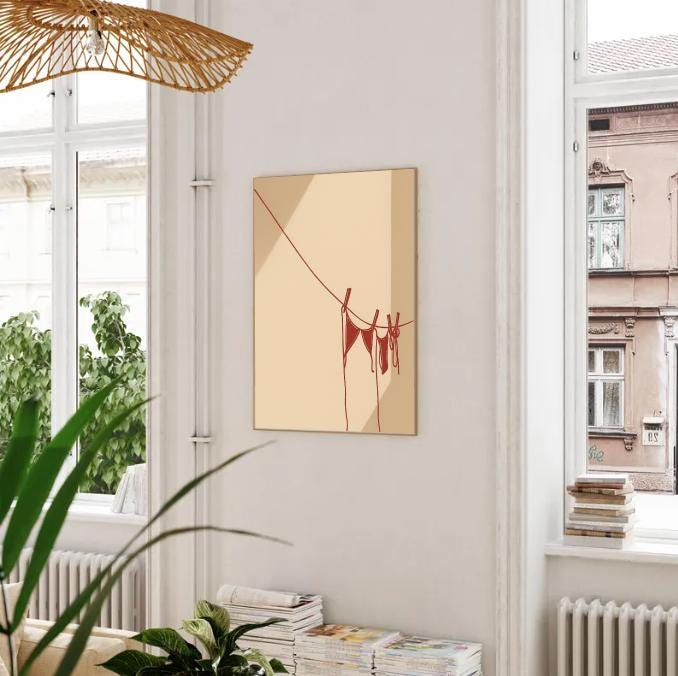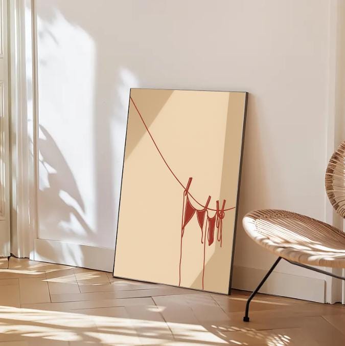 Minimal Clothesline Bikini Art Print - Turn your wall into a statement of modern simplicity and quiet sensuality. This minimalist bikini line art print captures the essence of effortless summer — warm tones, clean lines, and a subtle touch of allure that elevates any room’s atmosphere. Perfect for lovers of modern minimalism, neutral aesthetics, and feminine energy, this artwork brings a soft yet confident vibe to bedrooms, bathrooms, dressing rooms, or art-filled studios. The sun-kissed beige background and rust-red swimsuit tones create a calm, sun-drenched ambiance inspired by coastal afternoons.