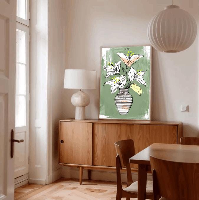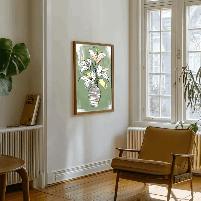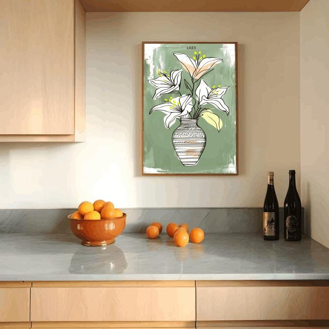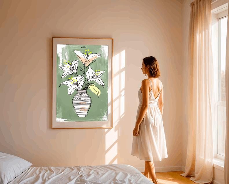 Modern Lily Wall Art Print - Bring timeless elegance into your space with this Modern Lily Wall Art Print. Featuring delicate white lilies in a textured vase against a rich green backdrop, this minimalist botanical artwork is perfect for adding a touch of calm sophistication to any home. Designed in a clean line-art meets watercolor style, this floral print combines contemporary design with classic botanical charm. The versatile green and white palette makes it a beautiful fit for modern, boho, rustic, or minimalist interiors. Whether styled in your living room, bedroom, office, or entryway, this piece is sure to brighten and balance your space.