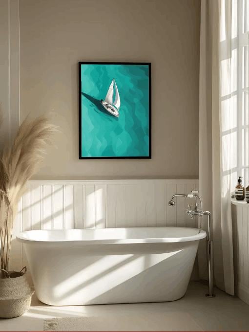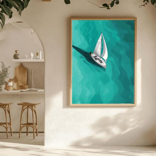 Sailboat Wall Art - Bring the calming beauty of the sea into your home with this minimalist sailboat wall art. Featuring a sleek sailboat drifting across turquoise waters, this nautical-inspired piece is perfect for ocean lovers, coastal homes, or anyone who dreams of sailing away into serenity. Designed in a modern, minimalist style, this artwork blends crisp nautical lines with soothing ocean tones, making it a versatile addition to beach houses, coastal-themed interiors, or modern wall galleries. The timeless sailboat silhouette adds a touch of adventure and tranquility to any space.