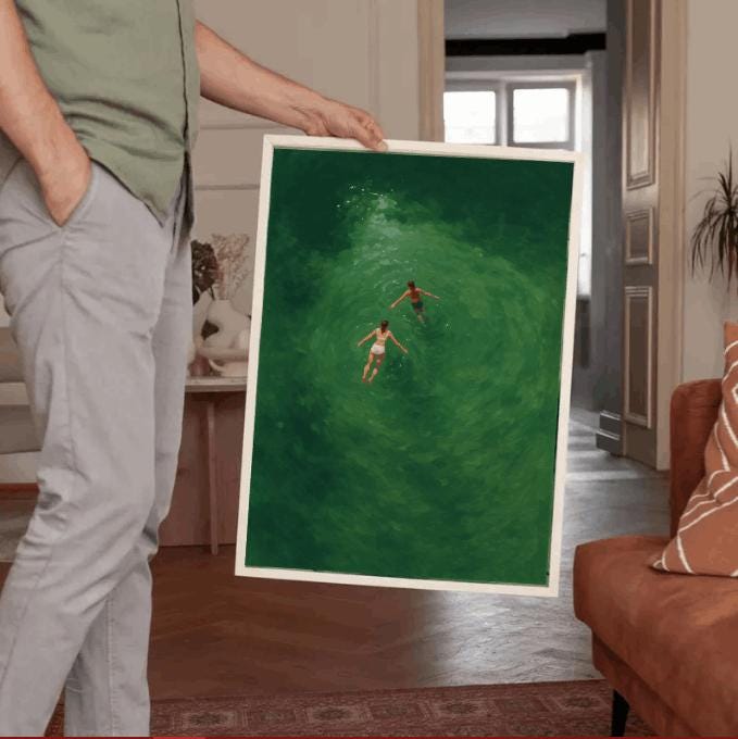 Minimalist Swimmers Wall Art - Capture the beauty of simplicity with this Minimalist Swimmers Wall Art. An aerial view of two swimmers moving gracefully through green waters, this artwork radiates calm, movement, and modern elegance. Perfect for beach houses, coastal cottages, living rooms, bedrooms, or contemporary office spaces, this piece brings a serene ocean vibe indoors. Its clean, painterly style pairs effortlessly with modern, Scandinavian, minimalist, and coastal décor.