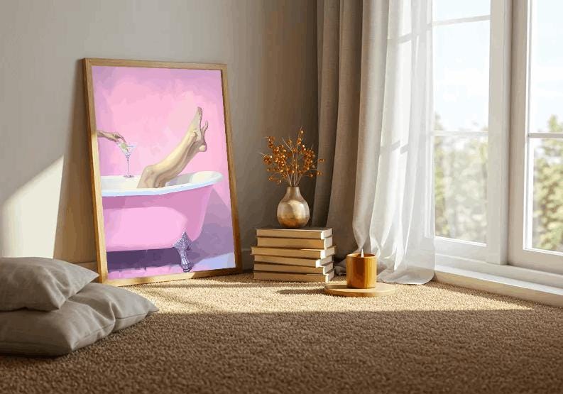 Pink Bathtub Wall Art - Turn your bathroom into a glamorous retreat with this Pink Bathtub Wall Art. Featuring elegant legs resting in a vintage clawfoot tub and a chic cocktail in hand, this piece radiates luxury, self-care, and feminine charm. Perfect for bathrooms, vanity rooms, home spas, salons, or chic apartments, this modern glam print blends playful elegance with a stylish minimalist design. The pink tones and striking composition make it ideal for feminine, glam, boho, or modern interiors.