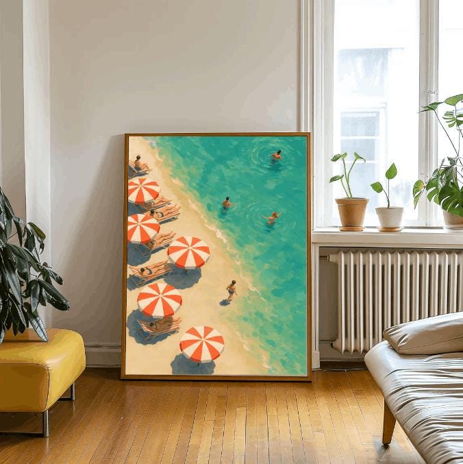 Imagine your walls transformed into a sunlit seaside escape. This art print pairs beautifully with mid-century, minimalist, or coastal décor, making it a versatile and stylish choice. Whether you’re decorating your living room, bedroom, entryway, or vacation home, this piece will infuse your space with warmth, joy, and vintage flair.