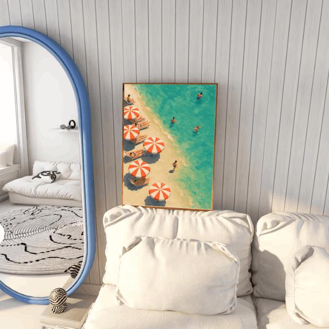 Retro Beach Umbrella Art - Bring timeless summer vibes into your home with this retro beach umbrella wall art. Featuring vibrant red-and-white parasols, sunbathers, and swimmers enjoying the turquoise seaside, this piece captures the charm of Mediterranean summers. Printed in high-resolution (300 DPI), this coastal artwork is ideal for a variety of spaces — from a modern coastal living room to a vintage-inspired beach house. Its nostalgic aesthetic and warm color palette make it a standout piece for anyone who loves ocean views and retro summer charm.
