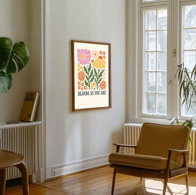 Retro Floral Wall Art Print - Brighten your walls and your mood with this “Bloom As You Are” floral wall art, featuring vibrant retro flowers and an uplifting positive affirmation. Perfect for adding a cheerful, vintage-inspired touch to your living room, bedroom, office, or creative space. This vintage botanical print combines bold, retro-inspired floral illustrations with a warm color palette of pink, orange, yellow, and green. Whether your décor style is bohemian, farmhouse, cottagecore, or eclectic, this retro flower art blends seamlessly while making a joyful statement.