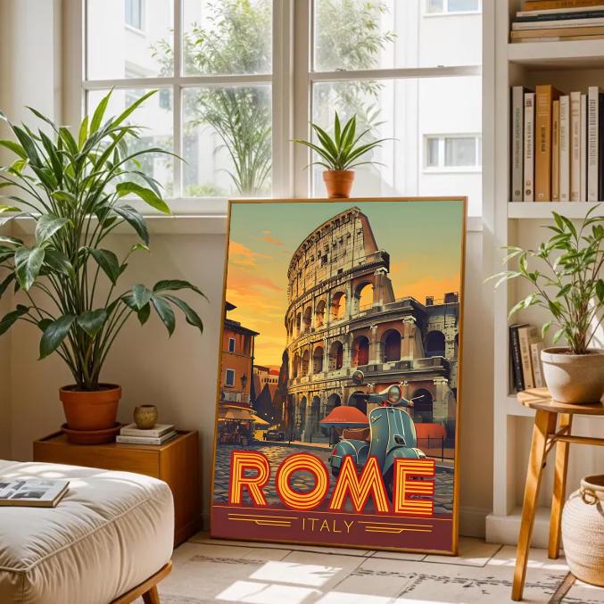 Rome Italy Wall Art - Capture the timeless beauty of Rome, Italy with this striking vintage travel poster wall art, featuring the legendary Colosseum at sunset alongside a classic Vespa scooter. This artwork brings the heart of Italy’s capital city to life in a bold retro style. Perfect for travel lovers, history enthusiasts, and Italian culture fans, this piece combines ancient architecture and everyday street charm, making it a standout addition to any wall. Its warm tones and nostalgic design pair beautifully with both modern and vintage interiors.
