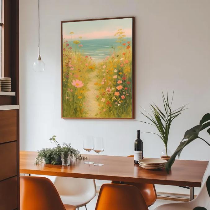 Wildflower Coastal Path Wall Art - Bring serenity and sunshine into your space with this wildflower coastal path art print. A soft blend of pastel tones, ocean blues, and blooming florals captures the peaceful beauty of a quiet walk to the beach — making it the perfect addition to any home that craves calm and color. Ideal for lovers of cottage-core, floral, and nature-inspired interiors, this piece evokes feelings of nostalgia, warmth, and gentle coastal breeze. The delicate wildflowers and dreamy seaside palette make it a stunning statement for living rooms, bedrooms, or cozy reading corners.