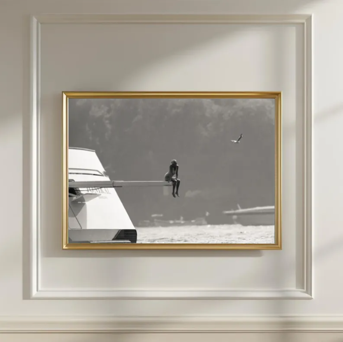 Minimalist Black and White Boat Photography - A striking black and white moment frozen in time—minimal, cinematic, and deeply atmospheric. This artwork captures a solitary figure perched at the edge of a pier, suspended between land, sea, and thought. The vast negative space, soft grain, and monochrome tones create a powerful sense of stillness that resonates with modern, minimalist, and quiet luxury interiors.