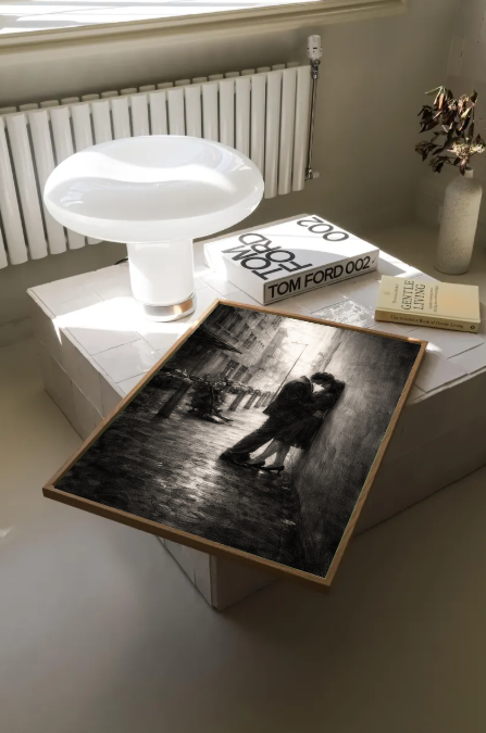 Black and White Romance Wall Art - A moment of passion caught in the rain. This striking black and white artwork instantly draws you in with its raw emotion, cinematic mood, and intimate city romance. Set on a rain-soaked street, this piece captures a couple locked in a quiet, powerful embrace against textured urban walls. The dramatic lighting, vintage grain, and monochrome palette give it a timeless, film-noir aesthetic that feels both nostalgic and deeply modern — a style currently trending in moody, minimalist interiors.